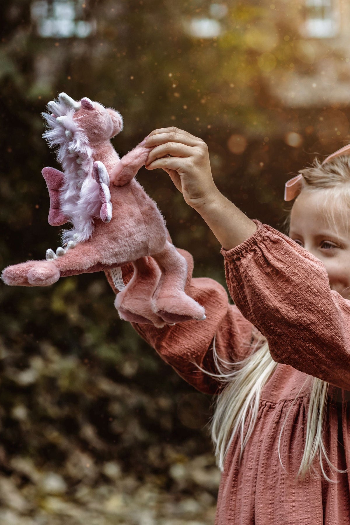 Child holding Hearts the pink dragon plush by Charlie Bears Bearhouse collectible